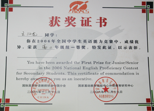 在由国家基础教育实验中心外语研究中心举办的“2006年全国中学生英语能力竞赛”NEPCS(National English Proficiency Contest Secondary)中,我校取得一等奖一名,二等奖十名,三等奖33名的好成绩,江明等17名老师获优秀指导教师奖。