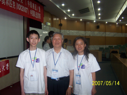 杨哲同学与原国家信息学奥赛领队,清华计算机系教授吴文虎教授合影(右一为杨哲辅导教师许洁