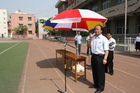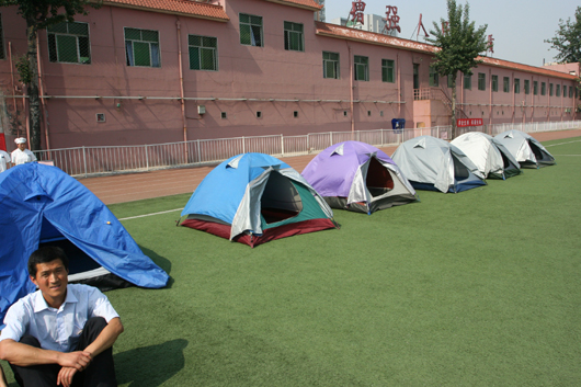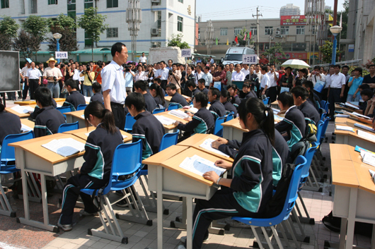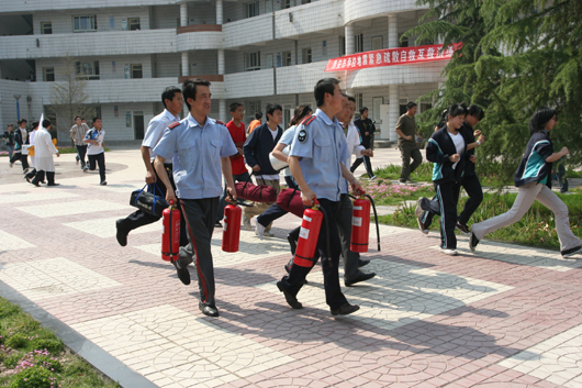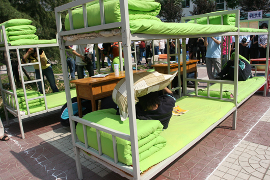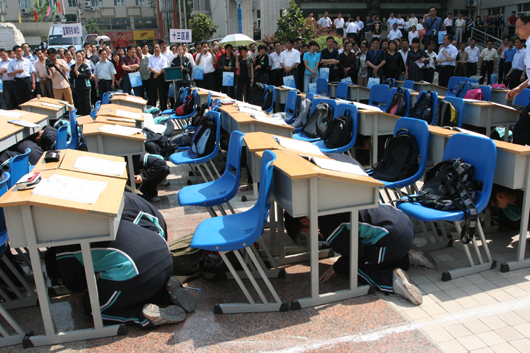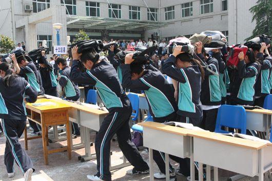 我校在喷泉广场上设置了模拟状态下的课堂和宿舍环境。模拟演练开始,高一年级11班48名学生正在上化学课,突然听到三声急促哨音,教室中的学生立刻躲到课桌下,在震情稍稍平缓后,老师立即组织学生撤离,学生们用书包护头往教室外跑去,来不及拿书包的学生则双手抱头朝室外跑去……同时,在宿舍休息的学生以被褥护头躲避在床下,随后又在号令指挥下进行疏散,生动地演示临危时的应急自救措施。