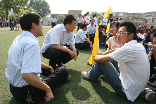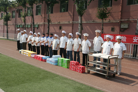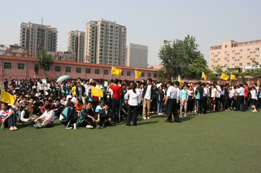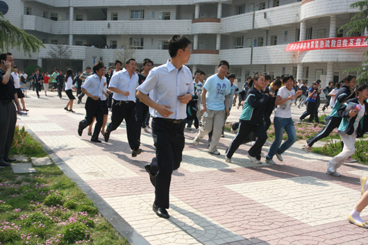接着,全校师生在模拟“5·12”四川汶川地震波及西安的情形,当预警信号的哨音响起后,学校全体师生紧急疏散,快速有序地撤离教室,按照预定路线分批向空旷的操场上集中。校救护队也急速出动,开展引导、救护模拟行动。在短短2分钟内,1000余师生已在操场列队集合,整齐有序地安坐在空旷场地。