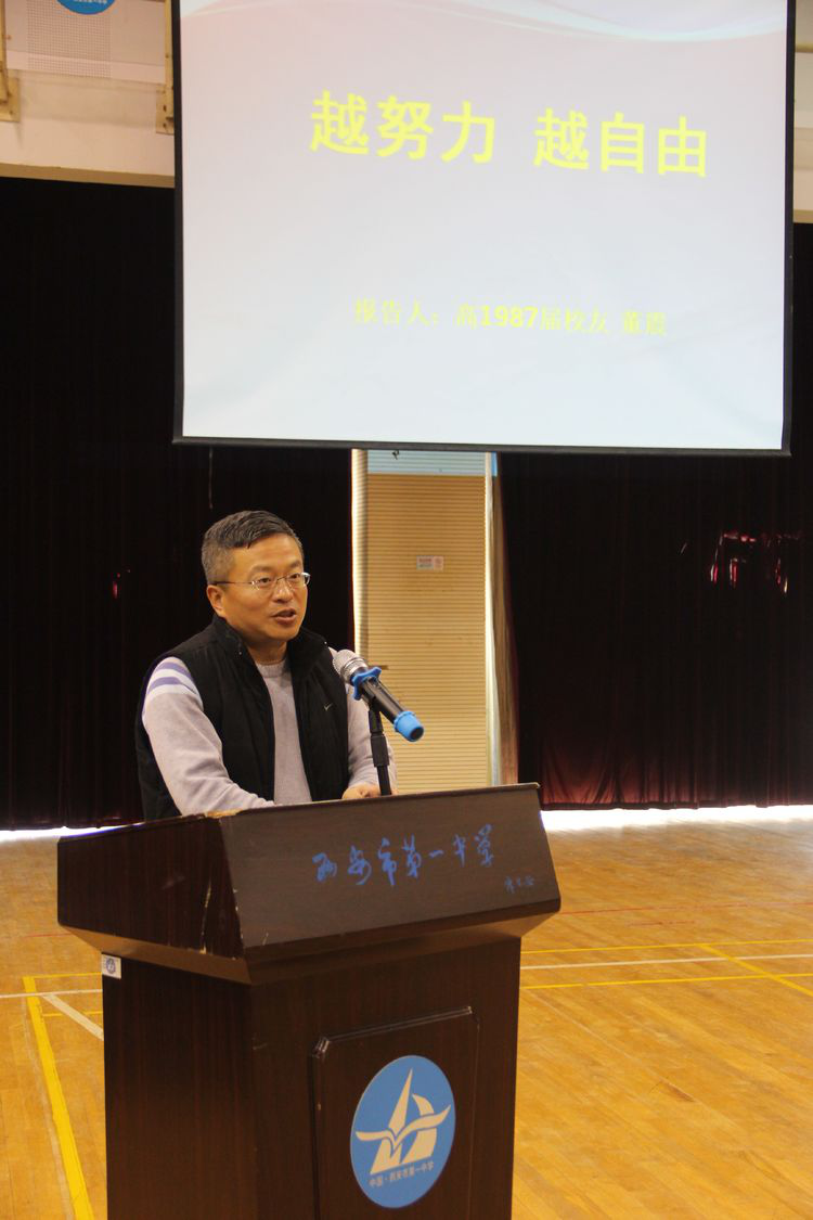 董震校友的报告以“父母的期许,孩子的福报”开始。他向大家讲述了自己从小学一直到工作,父母发现、鼓励他挖掘潜能,促进他成长的经历。包括安排他小学阶段两次跳级,初中阶段没有责怪他拆装并损坏家里的电风扇,放弃家门口的高中学校自荐到电子pg下载入口读高中等。董震校友认为,父母基于对孩子的充分了解,为孩子制定阶段性较高目标并协助孩子完成,对孩子终身发展大有益处。 董震校友以“师恩铸造灵魂”向师生们讲述了自己的高中生活。他与自己的同学们直至今天依然钦佩、感激班主任欧绪彤老师。欧老师学识渊博、平等待人、教育方法得当,在班级管理中以学生为本,既有不怒而威的严师形象,还有不笑也亲的慈父情怀。董震校友认为,好老师不但能让学生成才,还能促进同学们形成正确的世界观、价值观、人生观,影响学生一生的发展。 董震校友还以“努力决定未来”为主题,讲述了自己的奋斗历程。他本科毕业后刚刚工作,单位召开国际会议需要同声传译,由于那次会议所讨论的主题为国际最前沿的科技成果,专业语库资料甚少,无人敢于承担同传任务,董震校友在向领导主动请缨后,吃住在办公室几个月,查询专业资料,了解来自全球的各个代表的英语发音特点,独自圆满地完成了三天会议的同声传译工作,得到了各方面的充分肯定与褒扬,他自己也以此为契机,不断学习,不断进步。董震校友认为,努力程度与成就大小正相关,越努力,未来越美好。 董震校友最后引用毛主席的《沁园春·长沙》中的句子“万类霜天竞自由”,再次向师生们阐释了他的报告主题“越努力越自由”。他在广播电视专业领域发展达到了较高的水平后,毅然跨界创办西西环保股份有限公司、西西环保建设有限公司等企业,为实现‘做质量世界第一的环保产品’理想而奋斗。他认为,在现在这个美好的时代,每个人只要从最开始就肯一直努力,生活就不仅仅是过日子那么简单,终有一天会得到拥有理想、实现理想的自由。
