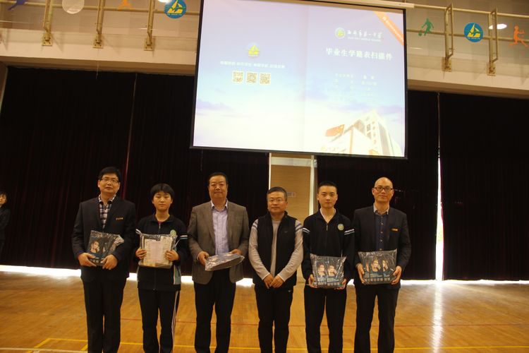史建奎校长代表学校向董震校友赠送了“高87届董震同学高中学籍档案册",并鼓励在场的全体同学要向董震校友学习,秉承“爱国 爱校 勤学 勤劳”校训,传承校园文化精神,相信阅读改变人生,努力成就未来!