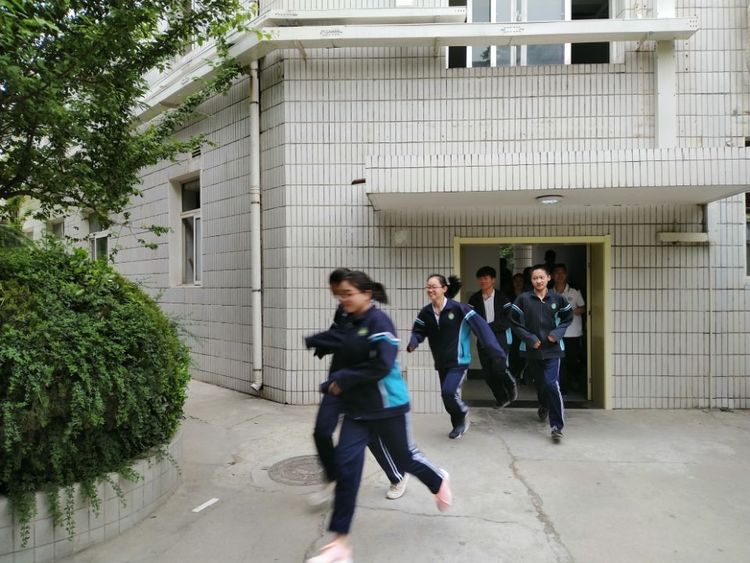 上午10点03分广播站发出防震警报,全体师生按照指定路线,手抱头,迅速有序的撤离教室。