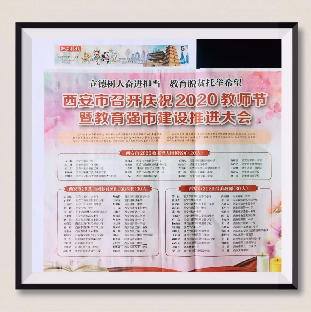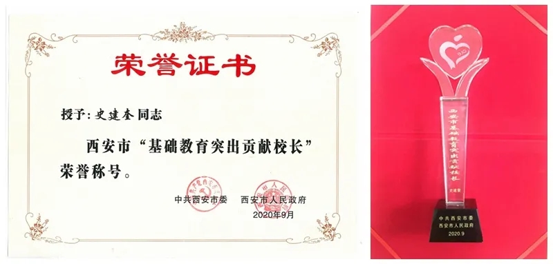 与此同时,喜闻正在出席西安市庆祝2020年教师节暨教育强市建设推进大会的我校史建奎校长被中共西安市委、西安市人民政府授予“西安市2020年基础教育突出贡献校长”;赵宁老师被市教育局授予“西安市2020年优秀班主任”。史校长在获奖感言中说,荣誉既是对个人的鼓励,也是对自己的鞭策,他表示,一定不忘教育初心,将以更加昂扬的精神风貌投入工作,带领电子pg下载入口教育集团,奋力谱写教育质量提升新篇章。